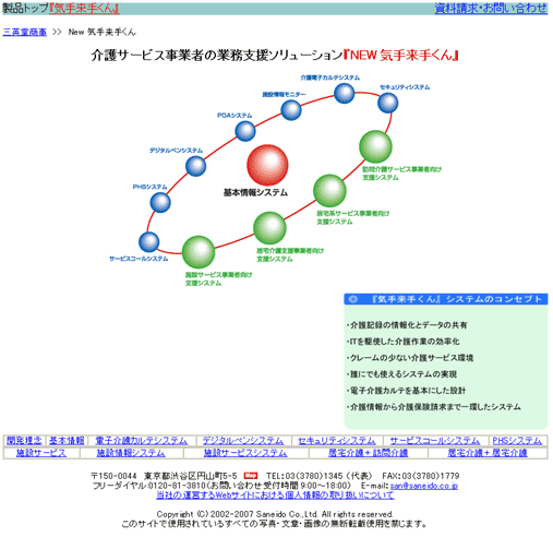 | 三英堂商事トップ >> システム販売 >> 施設サービス事業者向けトータル支援システム『気手来手くん』 | |